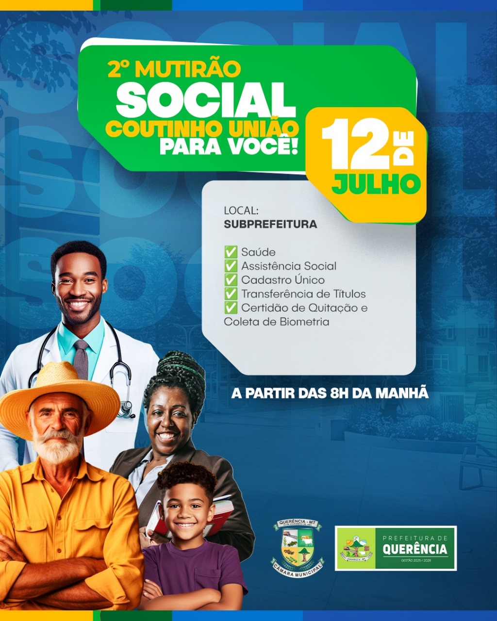 No dia 12 de julho, a Subprefeitura do Assentamento Coutinho União será palco do 2º Mutirão Social, uma grande ação promovida pela Prefeitura Municipal de Querência, em parceria com a Câmara Municipal de Vereadores, suas secretarias, a Associação Nova Esperança e a Subprefeitura local.