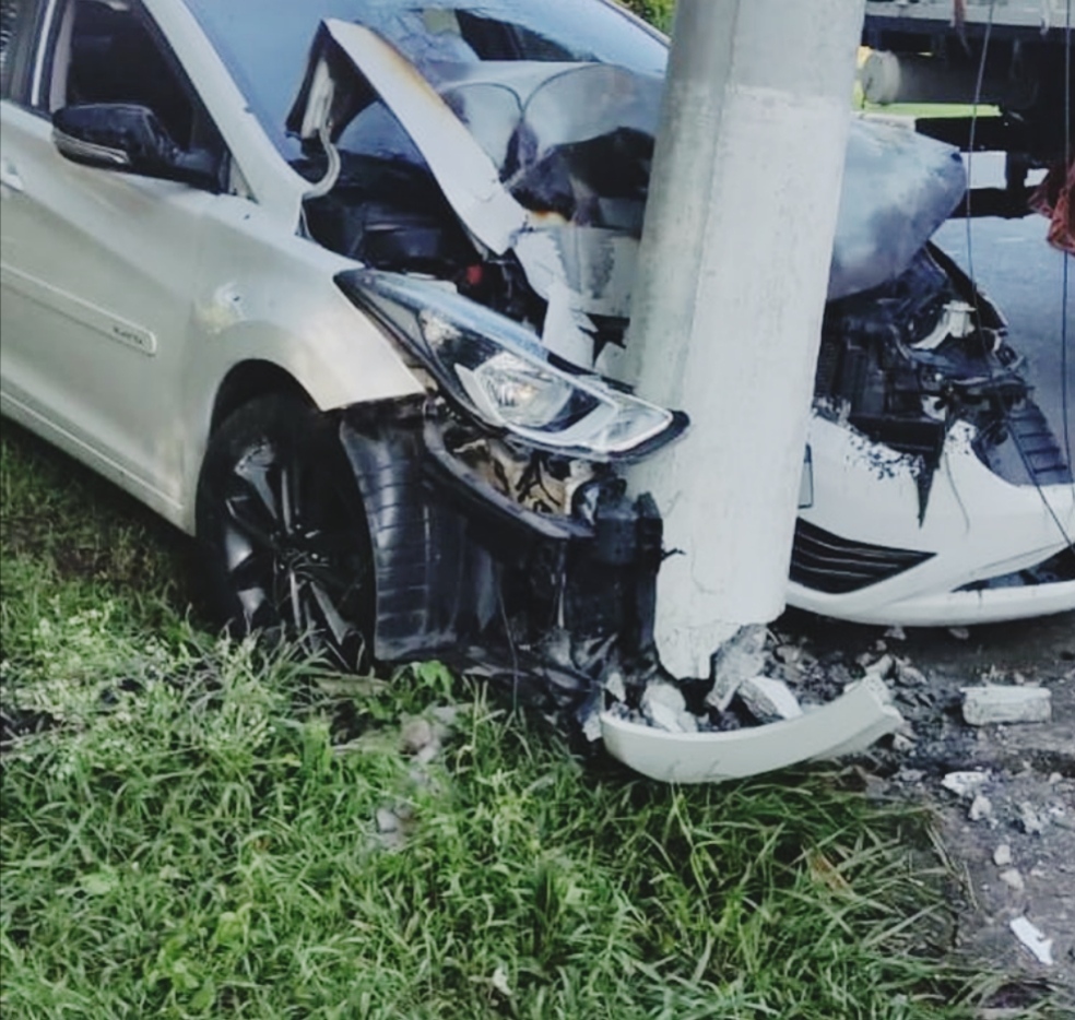 Ao se desviar de uma "pedra" motorista bate em poste e danifica a frente do carro