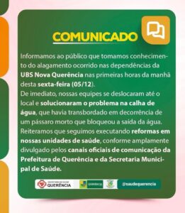 A Unidade Básica de Saúde Nova Querência iniciou a manhã desta sexta-feira (05/12/25) com um contratempo inesperado: parte do prédio amanheceu alagada. O incidente foi identificado logo nas primeiras horas do dia, quando funcionários perceberam o acúmulo de água no interior da unidade.