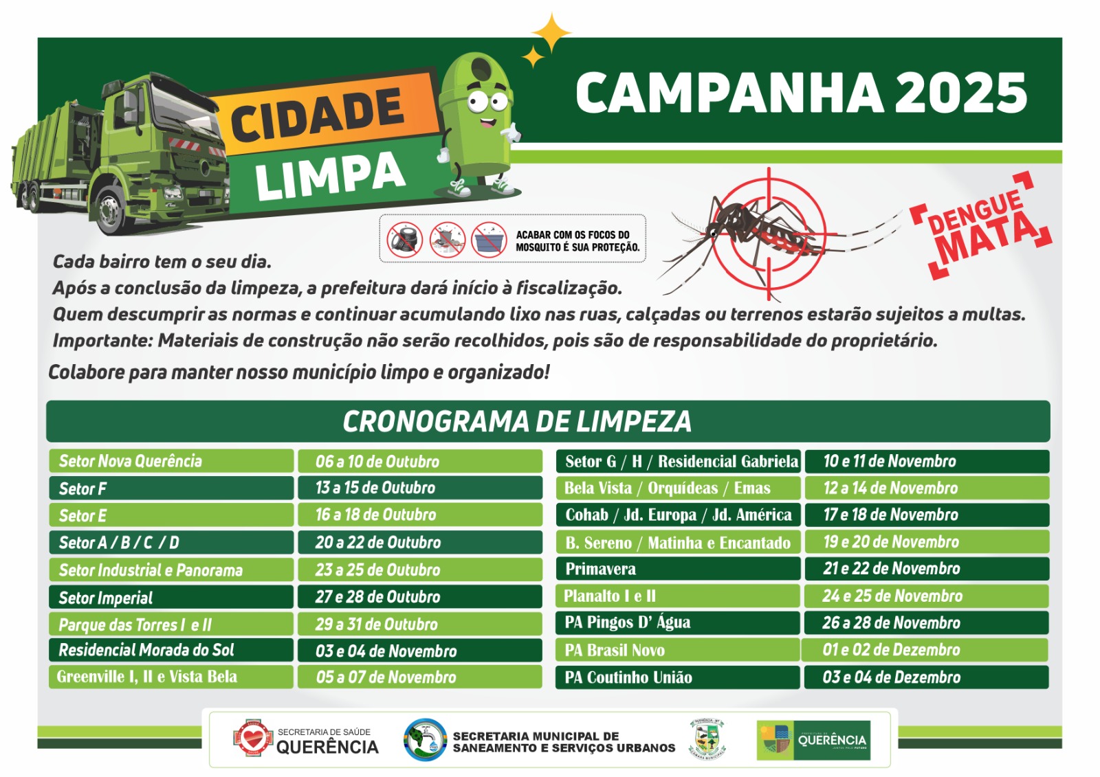 A Prefeitura Municipal de Querência, em parceria com as Secretarias de Saúde e de Saneamento e Serviços Urbanos, lança a campanha Cidade Limpa 2025, com o objetivo de promover a limpeza dos espaços públicos e reduzir a proliferação do mosquito da dengue, prevenindo o aumento de casos na cidade.