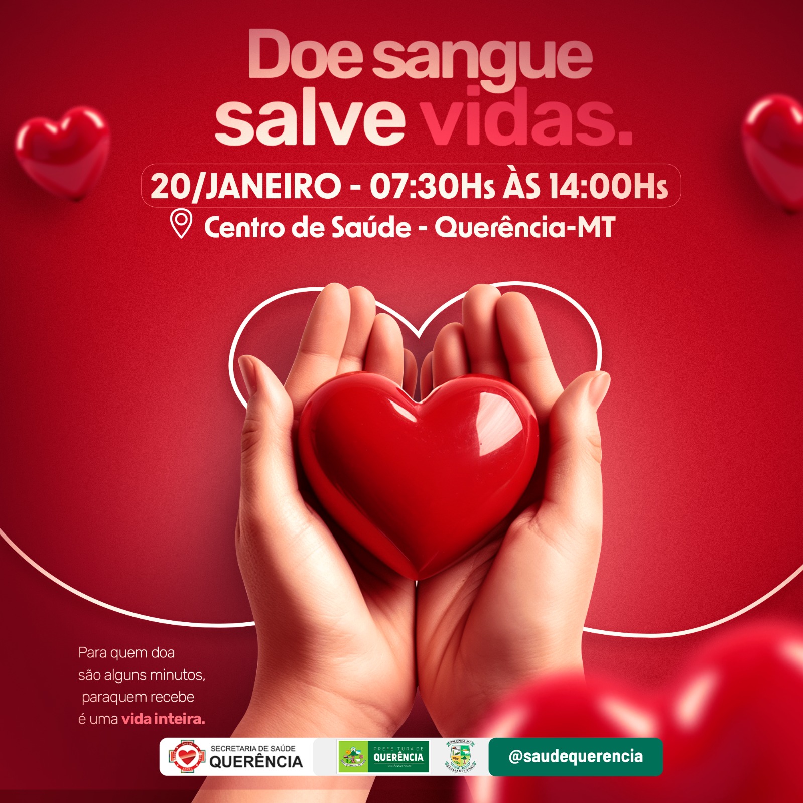 A cidade de Querência (MT) recebe, no dia 20 de janeiro, uma importante ação de solidariedade voltada à doação de sangue. A campanha “Doe sangue, salve vidas” será realizada no Centro de Saúde do município, das 7h30 às 14h.