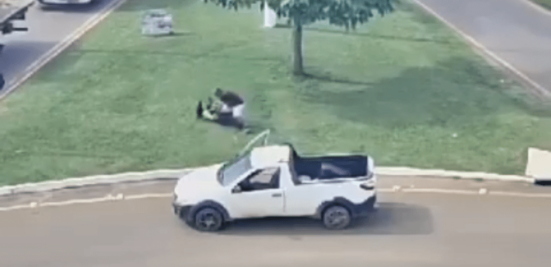 As imagens mostram quando J.B.L., de 50 anos, retira a mulher do veículo, que está com uma bebê no colo, e a joga no canteiro da via pública, a agredindo na sequência.