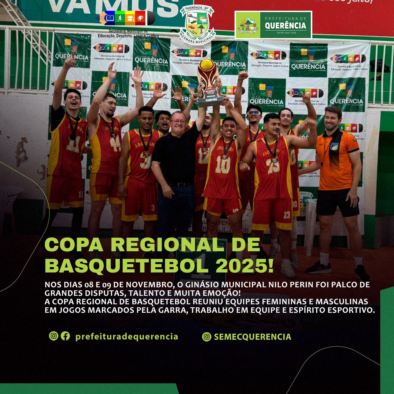 Nos dias 8 e 9 de novembro, o Ginásio Municipal Nilo Perin foi palco de grandes disputas durante a Copa Regional de Basquetebol 2025. O evento esportivo movimentou o fim de semana em Querência, reunindo equipes masculinas e femininas em jogos marcados por intensidade, talento e espírito de equipe.