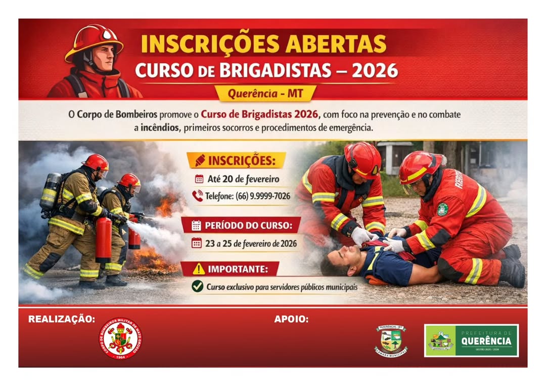 Estão abertas as inscrições para o Curso de Brigadistas 2026, promovido pelo Corpo de Bombeiros Militar em Querência (MT). A capacitação tem como objetivo preparar servidores públicos municipais para atuar na prevenção e no combate a incêndios, além de oferecer treinamento em primeiros socorros e procedimentos de emergência.