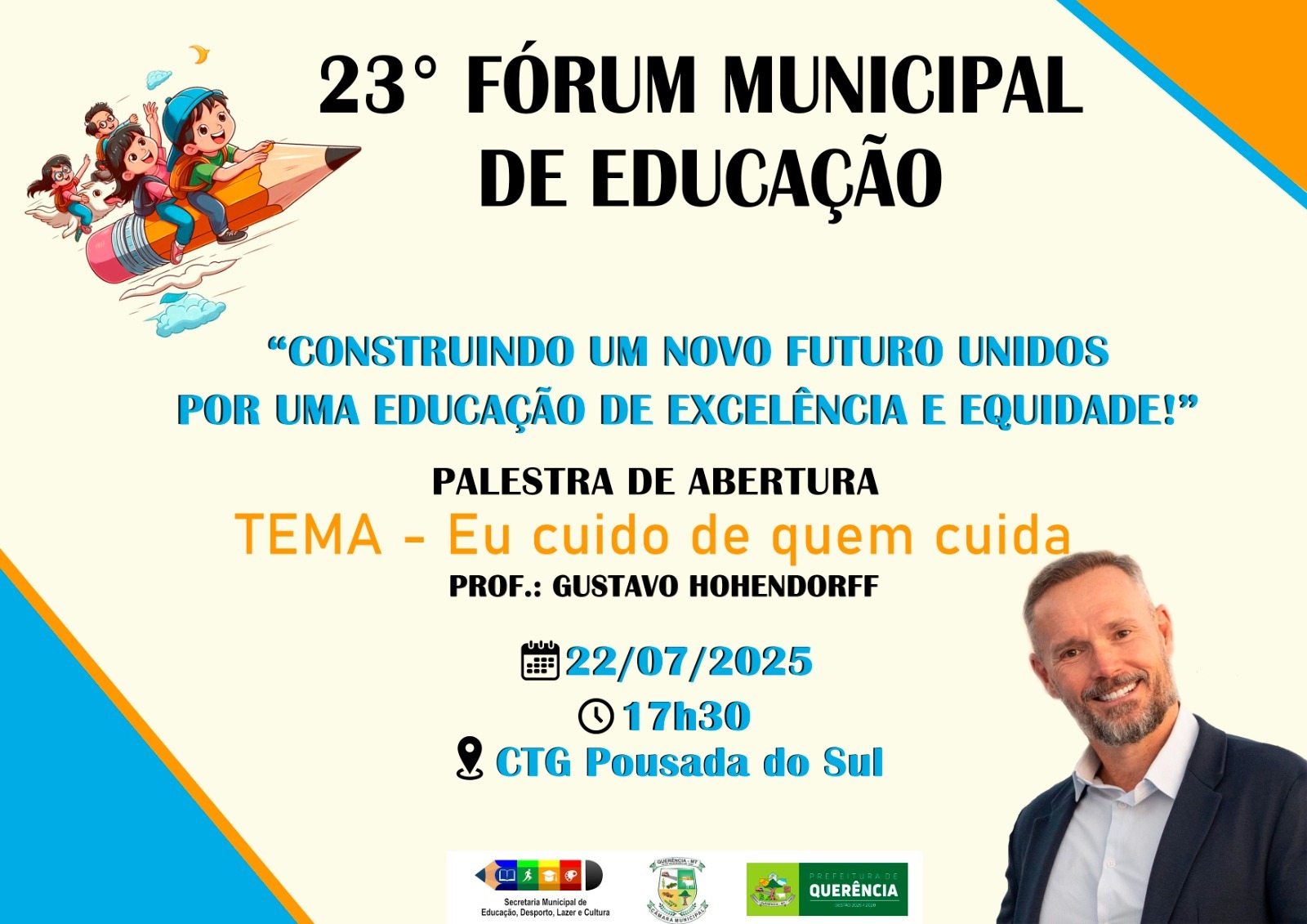 Nos dias 22 e 23 de julho, o município de Querência sediará a 23ª Edição do Fórum Municipal de Educação, voltado aos servidores da rede municipal de ensino. Com o tema “Construindo um novo futuro: unidos por uma educação de excelência e equidade”, o evento tem como objetivo promover reflexões, trocas de experiências e a valorização do trabalho educacional.