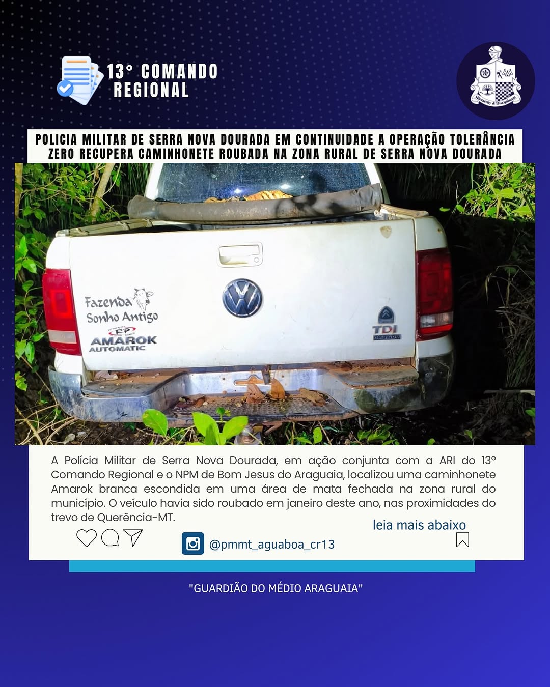A Polícia Militar de Serra Nova Dourada, em ação conjunta com a ARI do 13º Comando Regional e o NPM de Bom Jesus do Araguaia, localizou uma caminhonete Amarok branca escondida em uma área de mata fechada na zona rural do município, neste último domingo (22/06/25). O veículo havia sido roubado em janeiro deste ano, nas proximidades do trevo de Querência-MT.