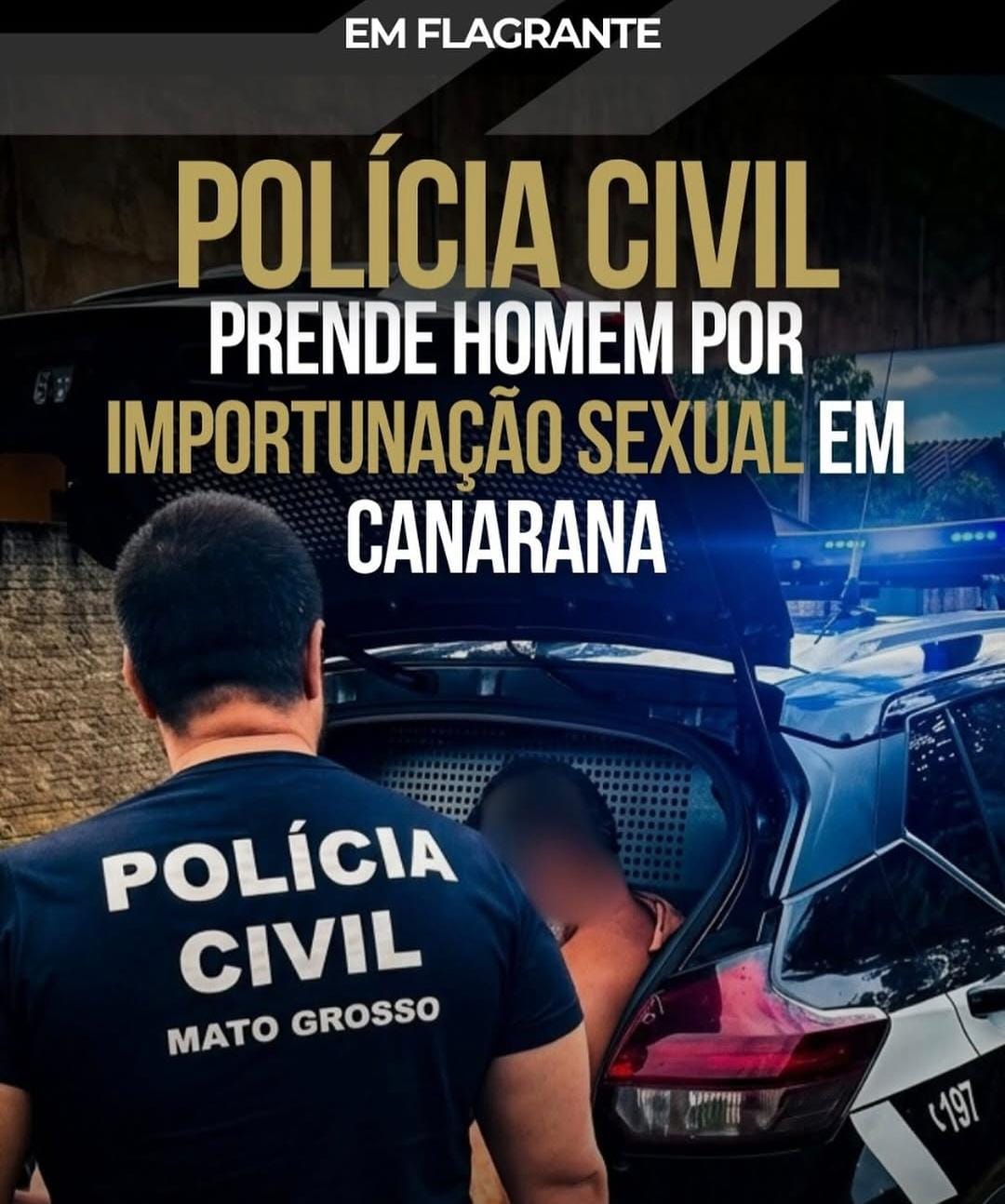 A Polícia Civil prendeu um homem por praticar o crime de importunação sexual, previsto no art. 215-A do Código Penal. A prisão foi realizada neste último sábado (21/03/26), em flagrante, pela equipe da Delegacia de Canarana, no município.