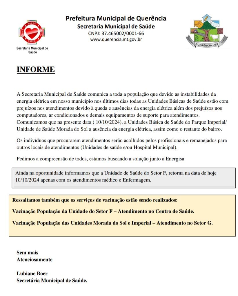 A Secretaria Municipal de Saúde comunica a toda a população que devido as instabilidades da energia elétrica em nosso município nos últimos dias todas as Unidades Básicas de Saúde estão com prejuízos nos atendimentos devido à queda e ausências da energia elétrica além dos prejuízos nos computadores, ar condicionados e demais equipamentos de suporte para atendimentos.
