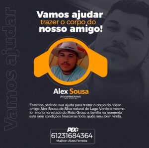 A família de Alex faz campanha para que o seu corpo seja transladado para sua cidade de Lago Verde-MA.