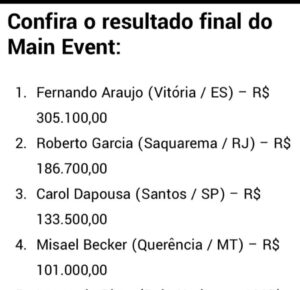 O outro participante; Jandrei Antônio Simon, que estreava no evento, foi desclassificado da mesa oficial, más no torneio paralelo, conseguiu ficar bem colocado e acabou faturando a premiação de pouco mais de R$10 mil.