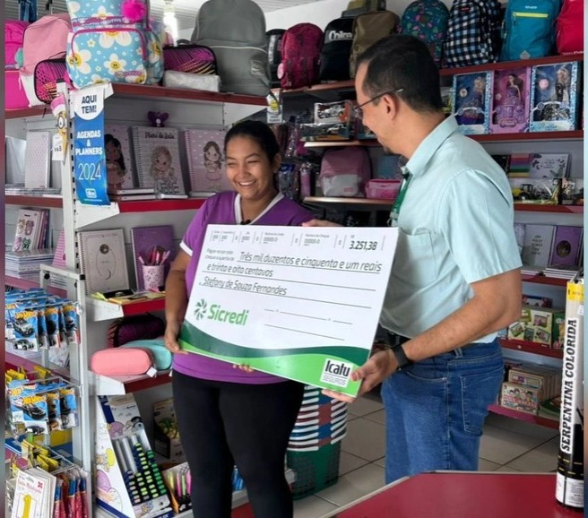 O gerente da agência da Sicredi Araxingu de Água Boa/MT, Rodrigo Aciole, entregou na tarde desta quinta-feira (14/05/24), o cheque para a associada Stefany de Souza Fernandes, vencedora do sorteio do seguro de vida realizado pela Icatu Seguros.