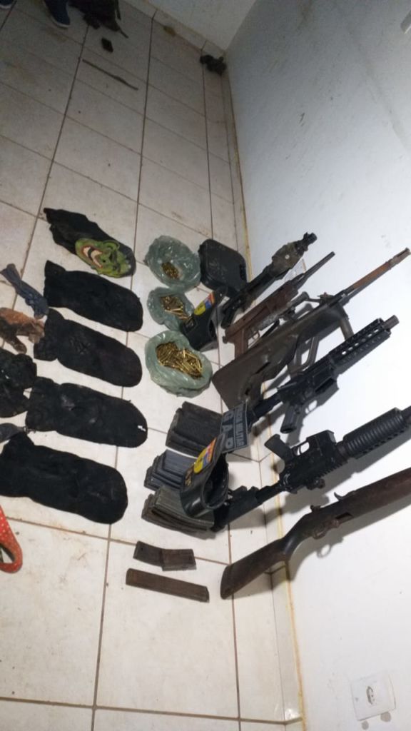 Na residência, a PM apreendeu cinco fuzis calibre 762, 30, 556, uma submetralhadora 9mm, espingarda, 18 carregadores e 242 munições dos mesmos calibres das armas apreendidas. Os policiais do Canil do Batalhão de Operações Policiais Especiais (Bope) foram acionados após as equipes localizarem um tonel, onde o suspeito confessou que havia retirado há dias atrás uma certa quantidade de drogas do local, mas nenhum entorpecente foi localizado durante a checagem dos policiais com cães farejadores.