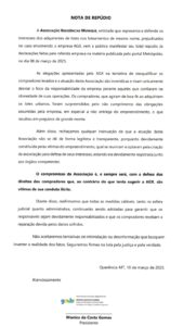 A ASSOCIAÇÃO RESIDÊNCIAS MUNIQUE, entidade que representa e defende os interesses dos adquirentes de lotes nos loteamentos de mesmo nome, prejudicados no caso envolvendo a empresa AGX, vem a público manifestar seu total repúdio às declarações feitas pela referida empresa na matéria publicada pelo portal Metrópoles, no dia 08 de março de 2025.