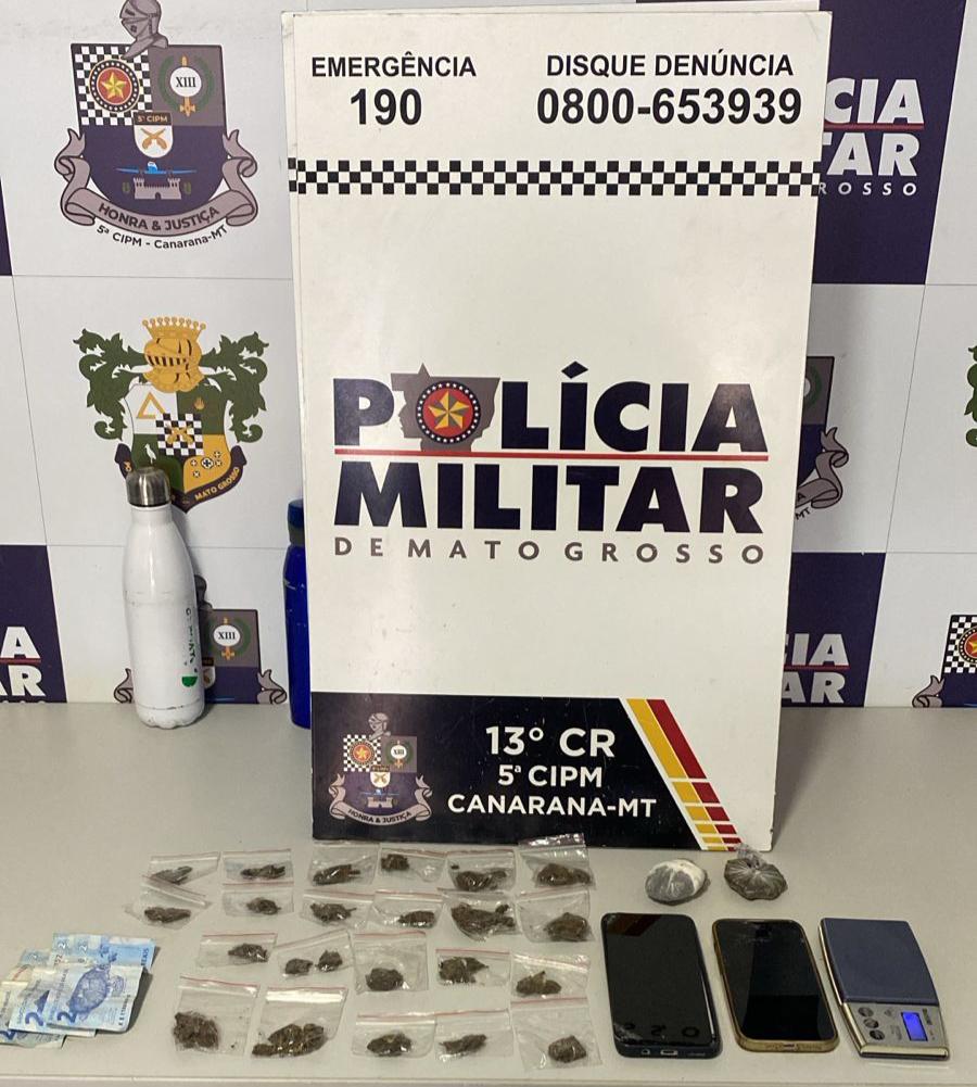 Em buscas na residência, foram localizadas outras porções de entorpecentes prontas para comercialização, dinheiro em espécie, dois aparelhos celulares e uma balança de precisão.