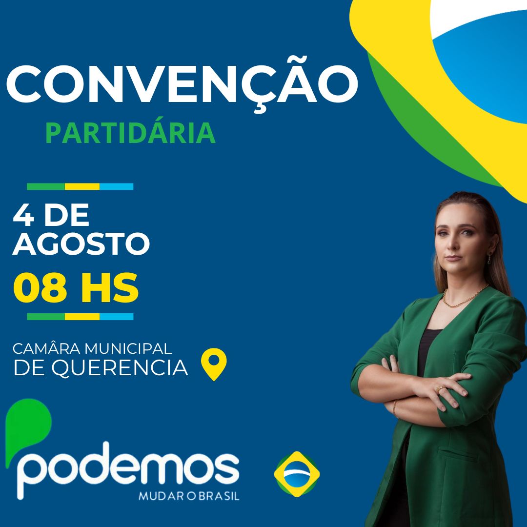 A presidente, Daiane Tamara Kelm, Presidente Municipal do partido “Podemos” convida a população querenciana a participar da Convenção partidária que será realizada na Câmara Municipal de Querência no dia 04 de agosto, a partir das 8h.