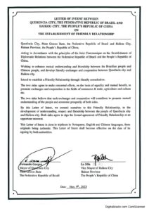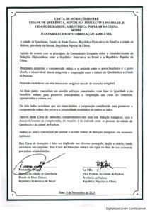 Abaixo carta assinada pelas autoridades brasileira e chinesa.