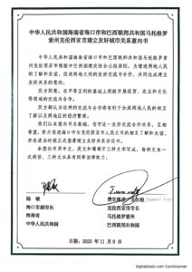 Através desta carta de intenções comprometemo-nos com essa Relação Amigável, com o desenvolvimento da compreensão, do respeito e da amizade entre as pessoas da cidade de Querência e da cidade de Haikou.