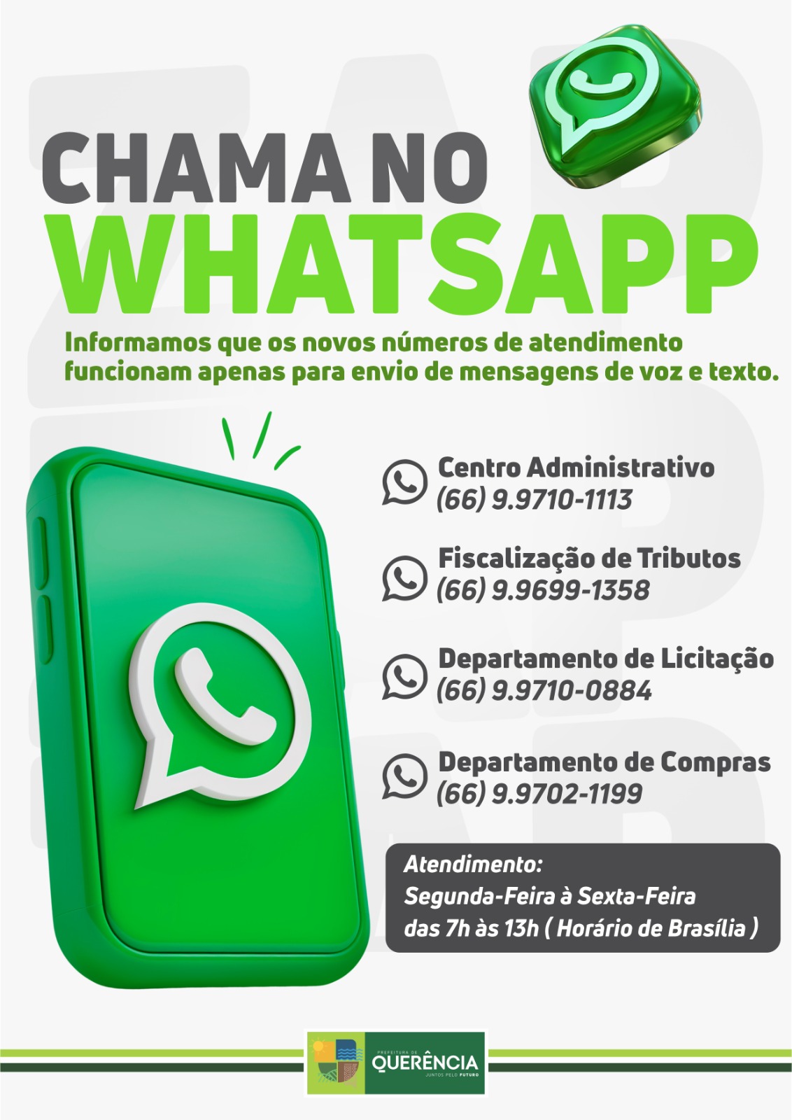 A Prefeitura Municipal de Querência informou que disponibilizou novos números de atendimento via WhatsApp para facilitar a comunicação entre a administração pública e a população. Os canais são destinados exclusivamente ao envio de mensagens de texto e de voz.