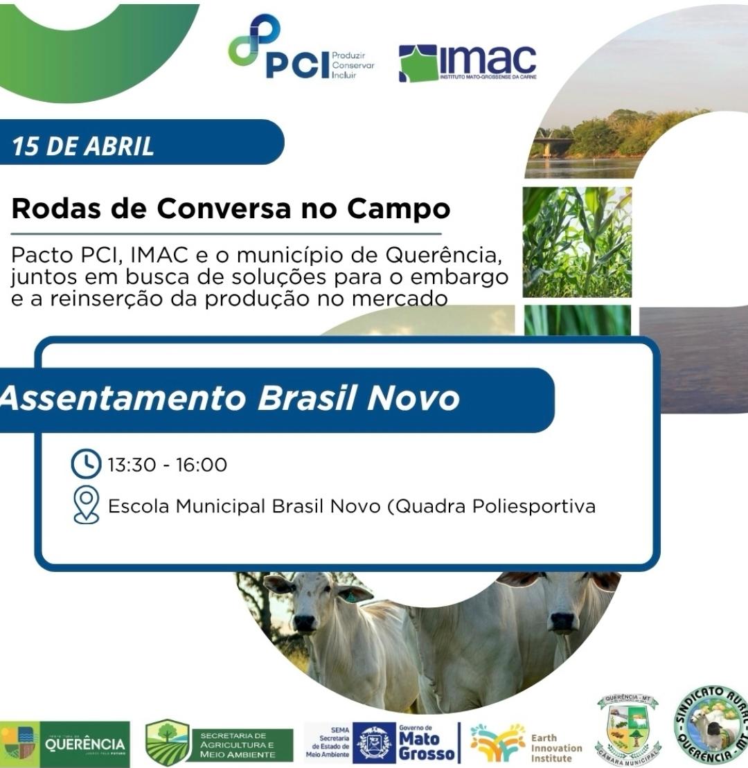 A Prefeitura de Querência, por meio da Secretaria Municipal de Agricultura e Meio Ambiente, realiza no próximo dia 15 de abril uma roda de conversa voltada aos produtores rurais do Assentamento Brasil Novo. A iniciativa conta com a parceria do Pacto PCI e do IMAC.