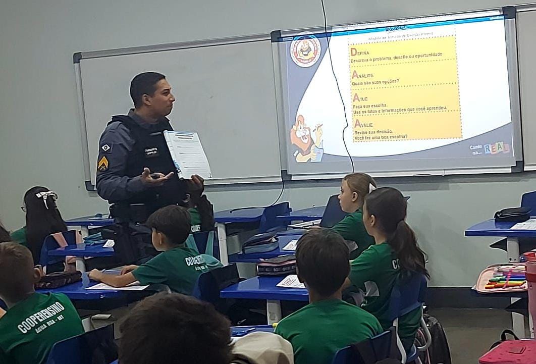 Alunos de Água Boa recebem aula do PROERD nas turmas de 5º ano do ensino fundamental da Escola Municipal Cristalino e Cooperensino
