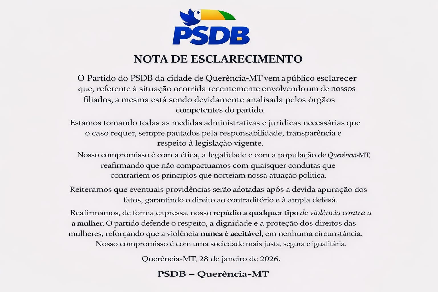 O diretório municipal do PSDB em Querência (MT) divulgou, nesta quarta-feira (28/01/26), uma nota de esclarecimento a respeito de uma situação recente envolvendo um de seus filiados. Segundo o partido, o caso está sendo analisado pelos órgãos competentes da legenda, conforme os trâmites internos previstos.