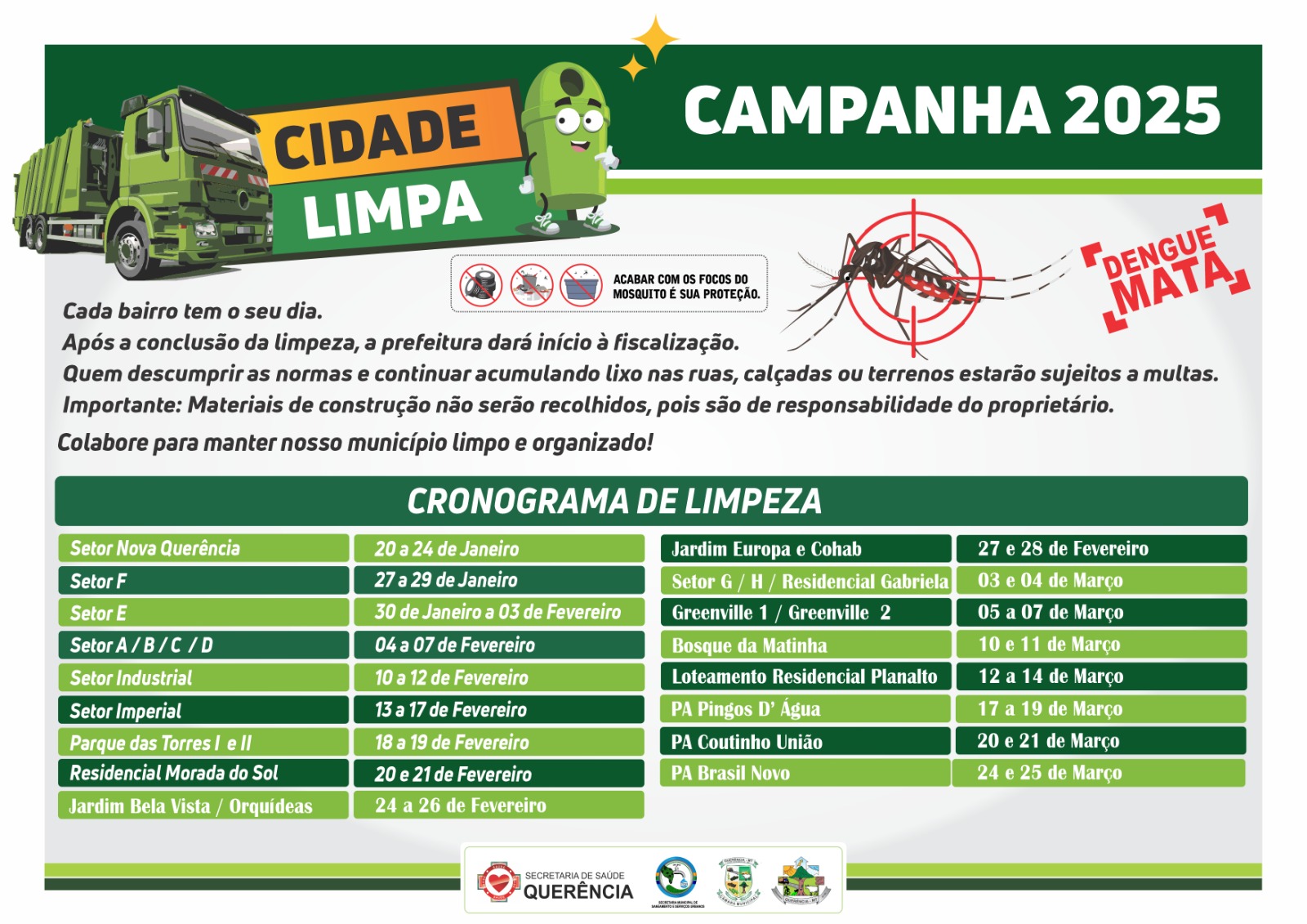 A Prefeitura de Querência, em parceria com as Secretarias de Saúde e de Saneamento e Serviços Urbanos, lança a campanha Cidade Limpa 2025, com o objetivo de promover a limpeza dos espaços públicos e reduzir a proliferação do mosquito da dengue, prevenindo o aumento de casos na cidade.