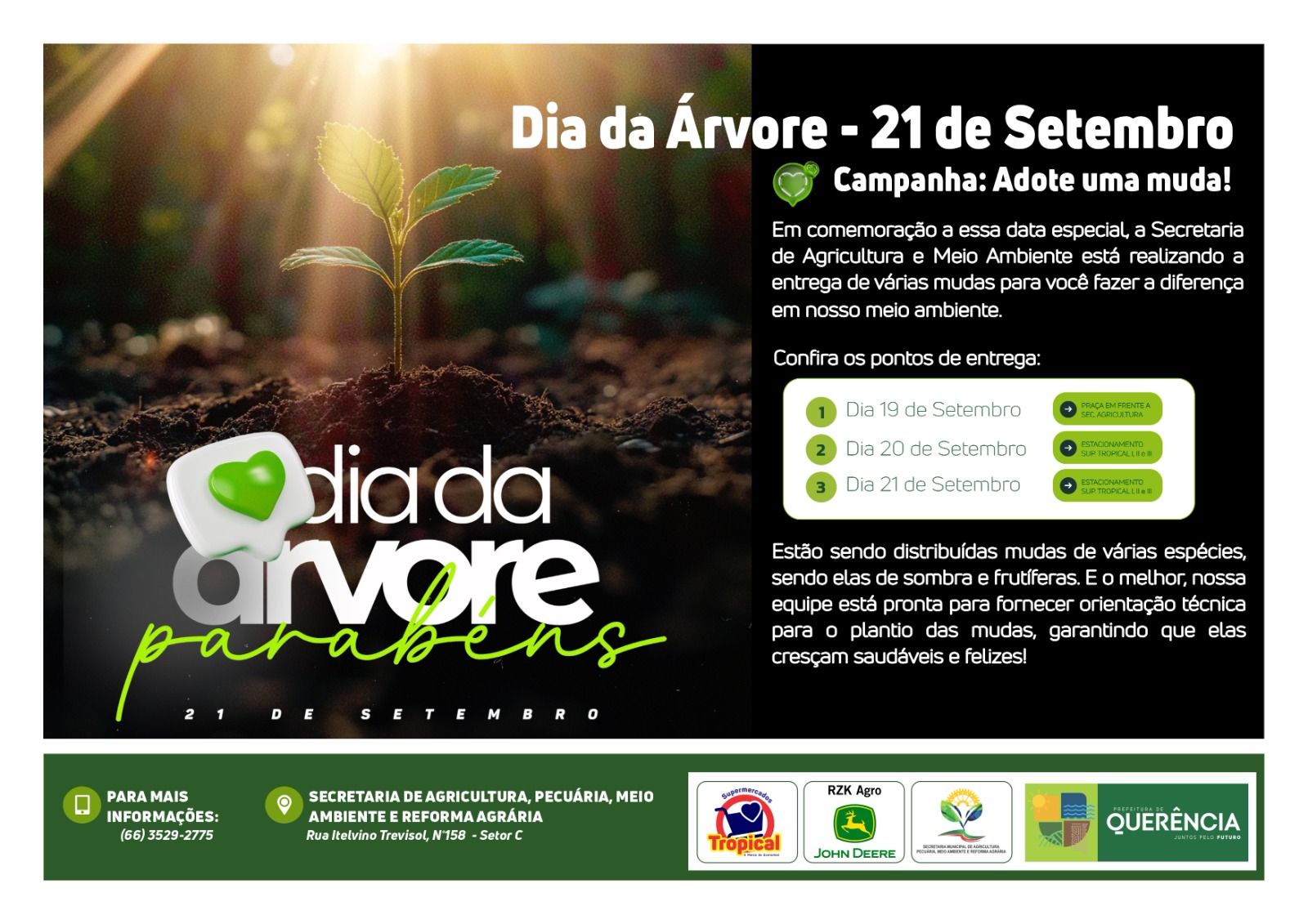 Com o objetivo de reforçar a importância do cuidado, da preservação e do plantio, será realizada a campanha “Adote uma Muda”, nos dias 19, 20 e 21 de setembro. Durante esse período, haverá a entrega de mudas à comunidade, incentivando a participação de todos na construção de um futuro mais verde e saudável para as próximas gerações.
