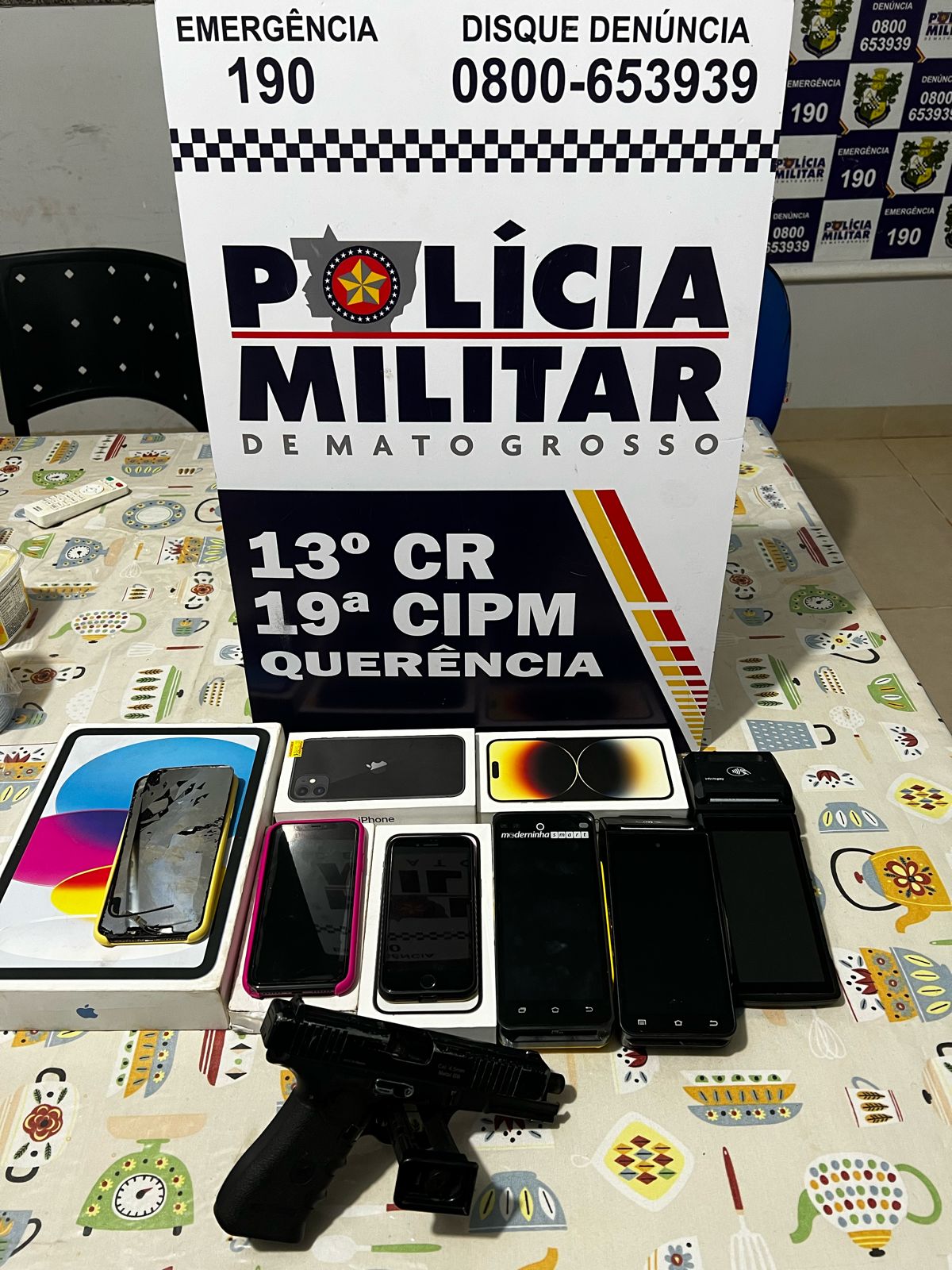 Com o indivíduo foi localizado o simulacro de arma de fogo utilizado no roubo, bem como, vários celulares e eletrônicos levados pelo suspeito. Diante dos fatos, suspeito foi detido e encaminhado para a Central de Atendimento PM de Querência, para a confecção do boletim de ocorrência e posteriormente apresentados na Delegacia de Polícia Judiciária Civil para demais providências.