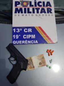 Chegando no local uma guarnição da PM , averiguou e checando o veículo juntamente aos suspeitos ,constataram que se tratava de um veículo furtado ,e no interior do carro com os meliantes haviam; um simulacro de arma de fogo ,uma quantia de dinheiro e porções de intorpecentes .