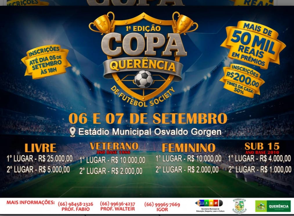 Querência se prepara para receber a 1ª edição da Copa Querência de Futebol Society, que promete movimentar a cidade nos dias 6 e 7 de setembro no Estádio Municipal Osvaldo Gorgen. A competição, considerada a maior da região, contará com premiações que somam mais de R$ 50 mil.