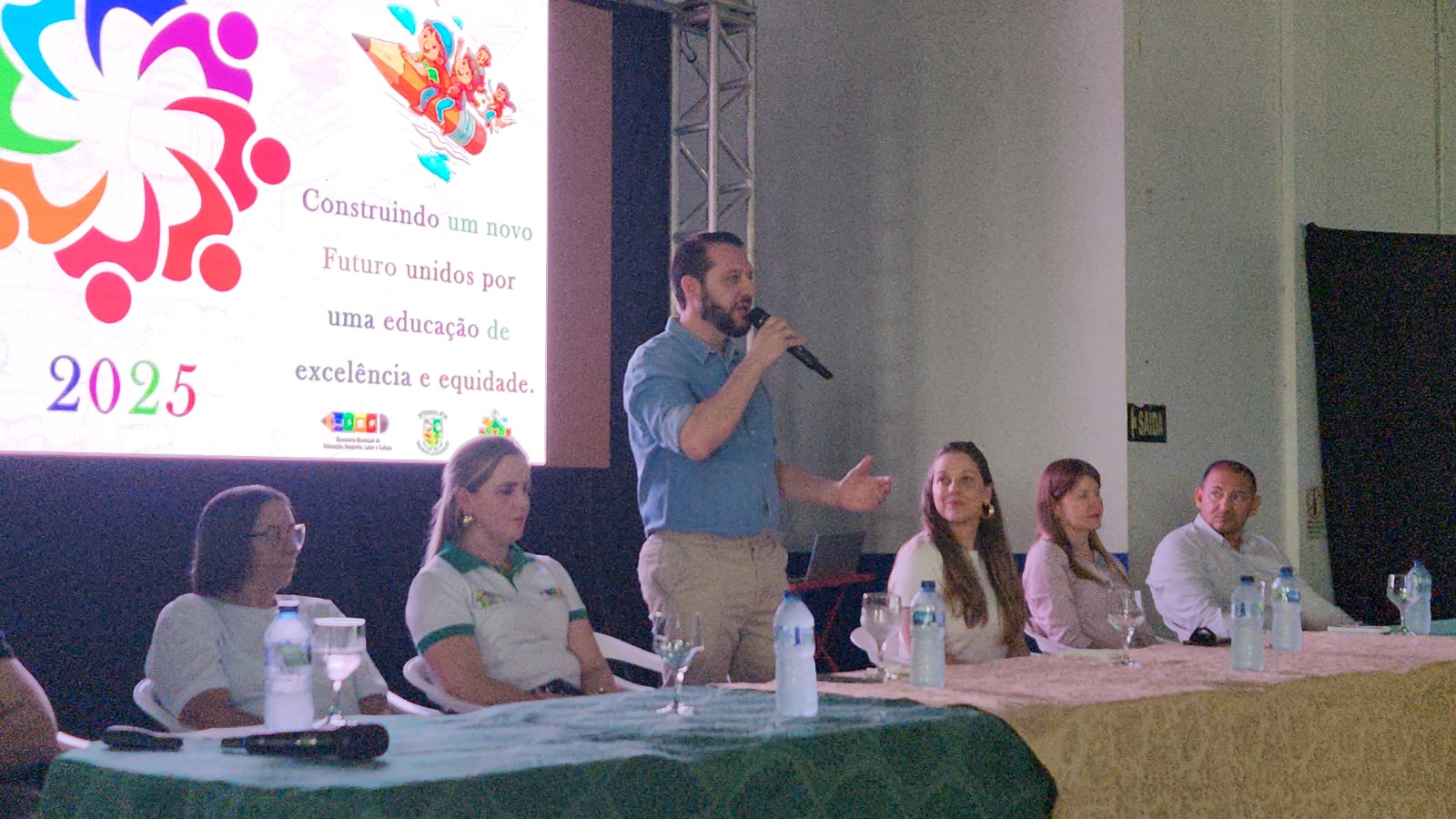 A Semana Pedagógica 2025 de Querência foi iniciada na manhã desta segunda-feira (27/01/25), com um evento realizado na ADESQUE. A cerimônia contou com a presença de autoridades políticas, como o Vice-Prefeito Dr. Kalil Jacob, a Secretária de Saúde Fernanda Rossi Negrini Jacob, a Secretária de Assistência Social Janice Wentz, o Chefe de Gabinete Telmo Alves de Brito, o Secretário de Finanças Cristiano Poter e a Secretária de Educação, Desporto, Lazer e Cultura, Marciele Eidt. Também estiveram presentes os vereadores Luiz Vezaro, Wilians da Saúde e Mestre Dragão.