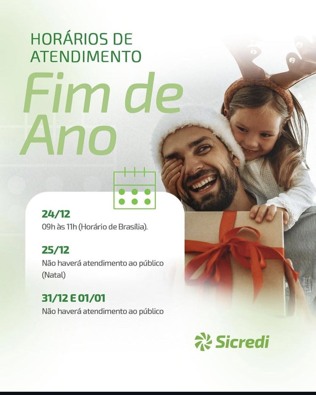O Sicredi informou alterações nos horários de atendimento ao público durante o período de fim de ano. De acordo com a cooperativa, na quarta-feira (24/12/25), o atendimento ocorrerá em horário especial, das 9h às 11h, conforme o horário de Brasília.